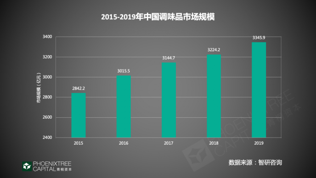 調(diào)味品自20世紀(jì)90年代后期開始市場(chǎng)化,2016、2017年資本熱度攀升,今年其與線上食品品牌、小家電一同躋身大消費(fèi)領(lǐng)域3大熱門賽道。據(jù)智研咨詢數(shù)據(jù),2019年中國調(diào)味品市場(chǎng)規(guī)模已達(dá)3345億元,8年間復(fù)合增長率為7.5%,前瞻產(chǎn)業(yè)研究院預(yù)測(cè)2020年有望突破4000億。