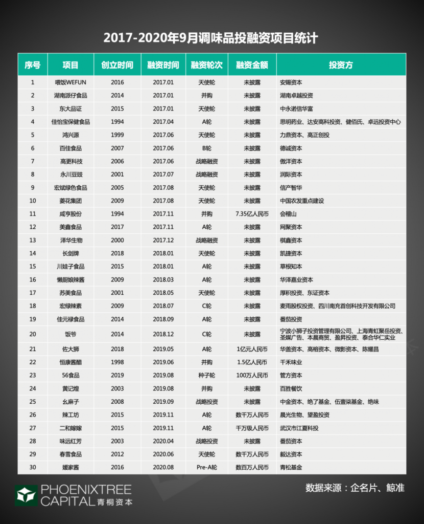 在一級(jí)市場(chǎng),資本普遍對(duì)調(diào)味品關(guān)注度很高。從鯨準(zhǔn)、企名片的融資數(shù)據(jù)來看,2017-2020年9月,共30個(gè)項(xiàng)目完成融資,2020年1-9月有3個(gè)。融資輪次主要集中在A輪之前,偏早期。
