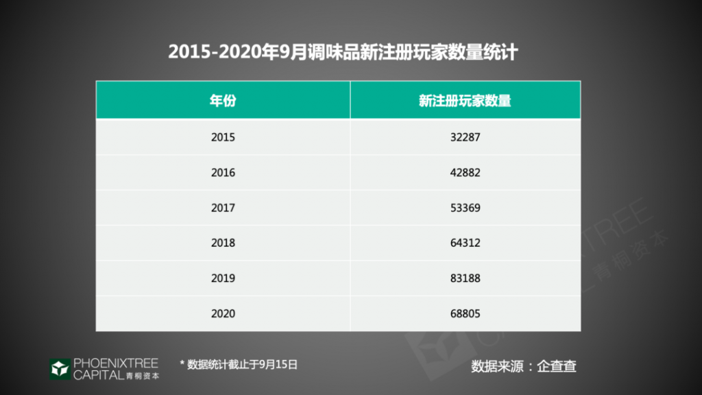 同時(shí),賽道新玩家數(shù)量逐年上漲,據(jù)企查查數(shù)據(jù),2020年1-9月,調(diào)味品新注冊(cè)企業(yè)共68805家,2019年為83188家,已是2015年的2.5倍。
