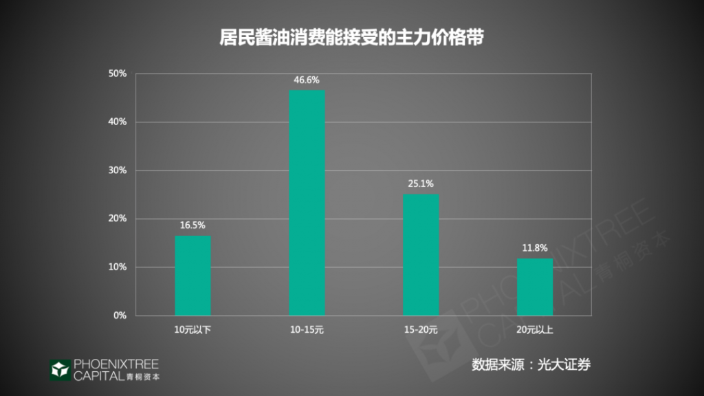 其次,產(chǎn)品價(jià)格不斷升級(jí),根據(jù)Euromonitor數(shù)據(jù),2019年我國調(diào)味品行業(yè)平均零售價(jià)為19.4元/千克,2014-2019年逐年上漲,復(fù)合增長率為3.5%。另據(jù)光大證券,國內(nèi)居民購買醬油的主力價(jià)格帶,也從10元以下,上升到10-15元,占46.6%。