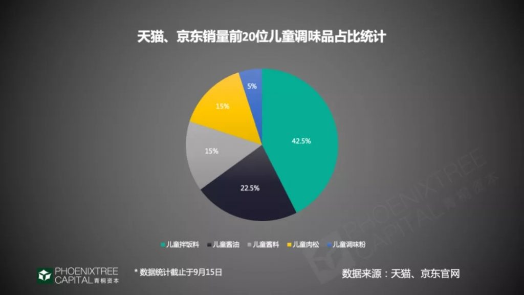 從品類來看,國產(chǎn)調(diào)味品居多,兒童拌飯料、兒童醬油最受歡迎。據(jù)智研咨詢數(shù)據(jù),國產(chǎn)兒童調(diào)味品占近70%。青桐資本統(tǒng)計(jì)天貓、京東數(shù)據(jù)發(fā)現(xiàn),兩大平臺(tái)銷量前20位的兒童調(diào)味品中,兒童拌飯料占42.5%,兒童醬油占22.5%。