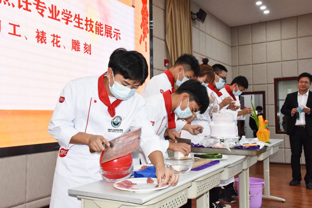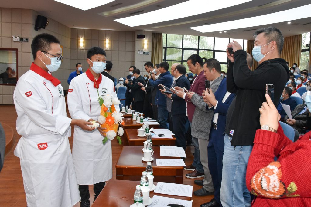 ? ? ? ?隨后,新生代表在現(xiàn)場(chǎng)進(jìn)行了刀工、裱花、雕刻等烹飪相關(guān)技藝展示,熟練的操作和精致的作品吸引了在場(chǎng)所有人員目光,并紛紛拍照留念。