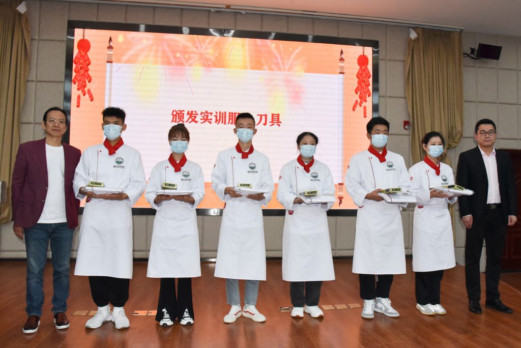 ? ? ? ?“工欲善其事,必先利其器”,為讓學(xué)生更好掌握烹飪技能,感受烹飪魅力,丁點(diǎn)兒股份向?qū)W院捐贈(zèng)了專業(yè)服裝、刀具等教學(xué)實(shí)訓(xùn)用品,并現(xiàn)場(chǎng)分發(fā)給21級(jí)新生代表。