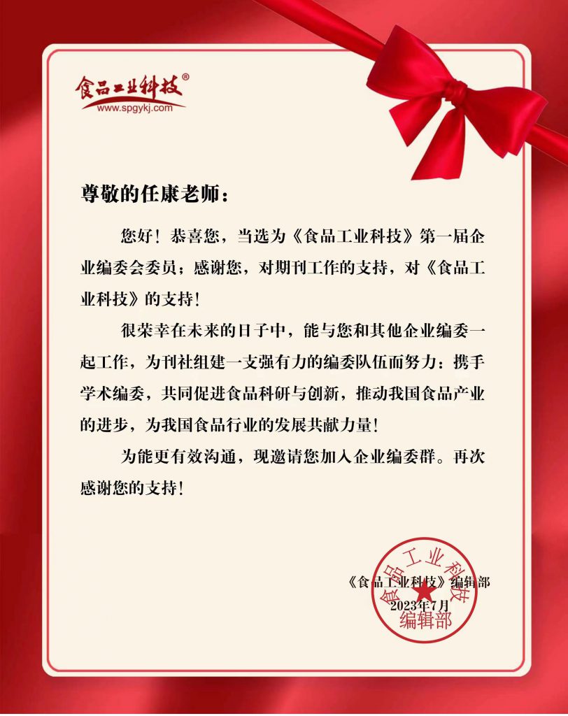 《食品工業(yè)科技》第一屆企業(yè)編委的選拔要求候選人具有高級專業(yè)技術(shù)職稱、較高的學術(shù)造詣、良好的行業(yè)口碑以及在推動行業(yè)技術(shù)創(chuàng)新做出重要貢獻。