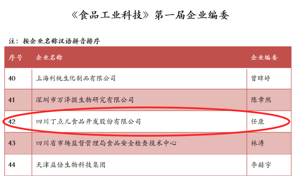 近日,中國權(quán)威學術(shù)期刊《食品工業(yè)科技》第一屆企業(yè)編委專家名單公布,四川丁點兒食品開發(fā)股份有限公司董事長任康成功當選。