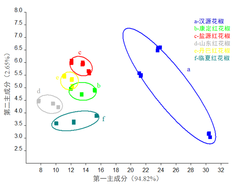 圖3:電子鼻傳感器對(duì)不同產(chǎn)地紅花椒響應(yīng)的 LDA 圖