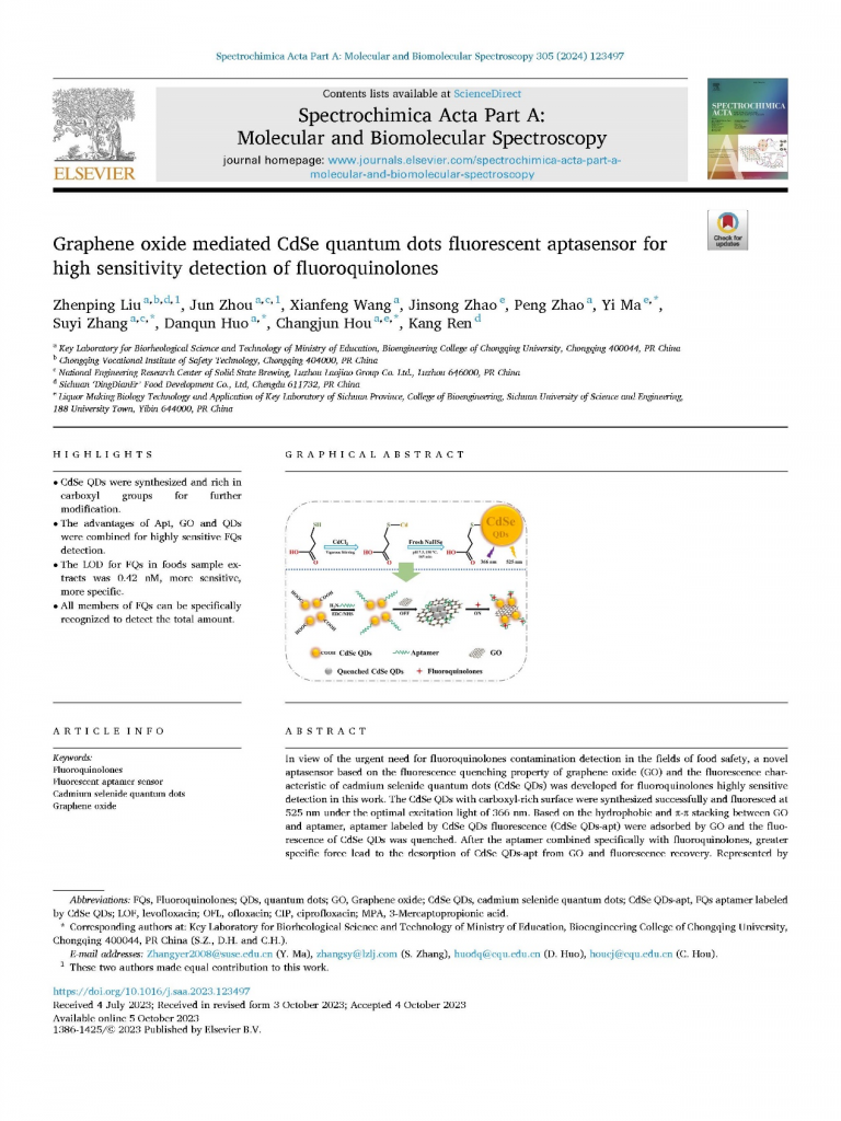 同樣是近日,由丁點兒股份董事長任康和企業(yè)發(fā)展顧問劉振平博士共同署名,與重慶大學(xué)等單位共同完成的基于量子點的創(chuàng)新技術(shù)成果《Graphene Oxide mediated CdSe quantum dots fluorescent aptasensor for high sensitivity detection of fluoroquinolones》(《氧化石墨烯介導(dǎo)的硒化鎘量子點熒光適配體傳感器對氟喹諾酮類抗生素的高靈敏檢測》【點擊跳轉(zhuǎn)原文】)在國際權(quán)威期刊(JCR Q1區(qū))《Spectrochimica Acta Part A Molecular and Biomolecular Spectroscopy》發(fā)表,國家發(fā)明專利也已公布并進(jìn)入實質(zhì)審查階段。