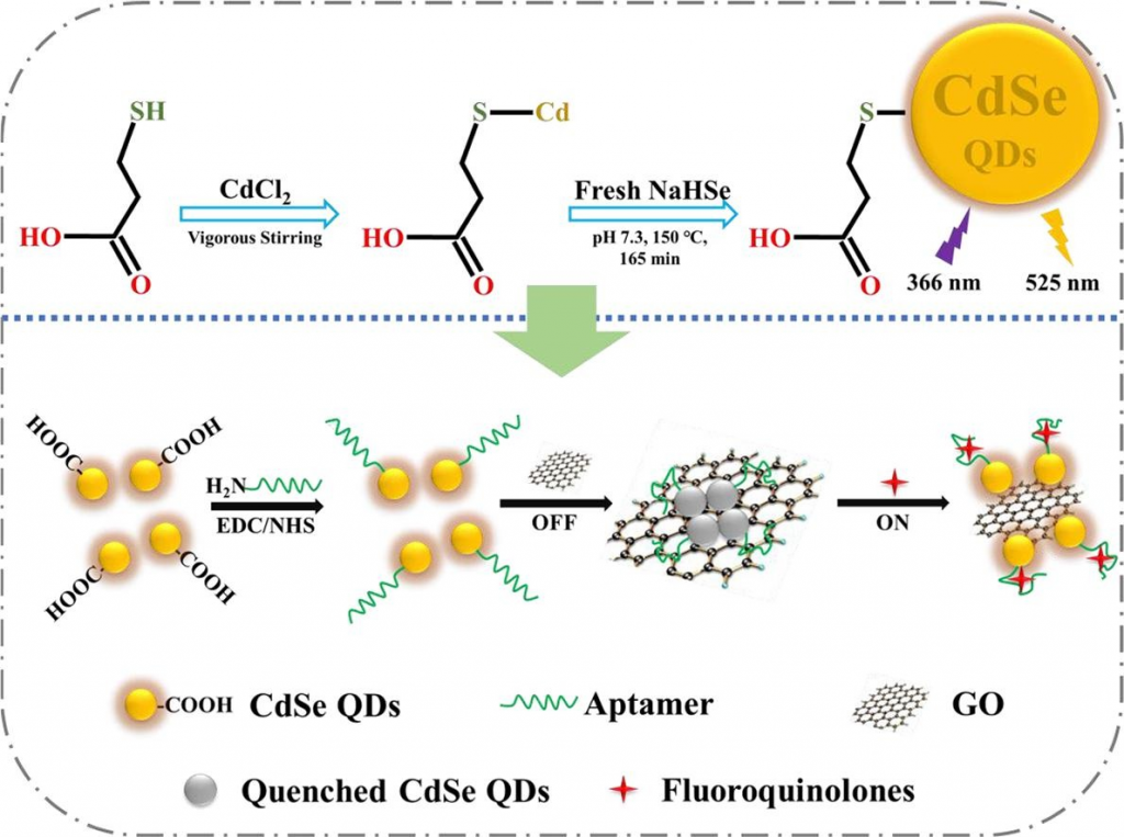 該項成果以3-巰基丙酸(MPA)為穩(wěn)定劑合成了表面易修飾、熒光性質(zhì)穩(wěn)定、水溶性良好的硒化鎘量子點(CdSe QDs),并將核酸適配體(Apt)的特異性識別功能、氧化石墨烯(GO)的表面特性和熒光猝滅性質(zhì)與CdSe QDs的特性融合在一起,構(gòu)建了GO介導(dǎo)的、基于CdSe QDs熒光標(biāo)記的適配體傳感體系用于動物食品中氟喹諾酮類抗生素(FQs)殘留的高靈敏檢測方法,達(dá)到國際先進(jìn)水平。