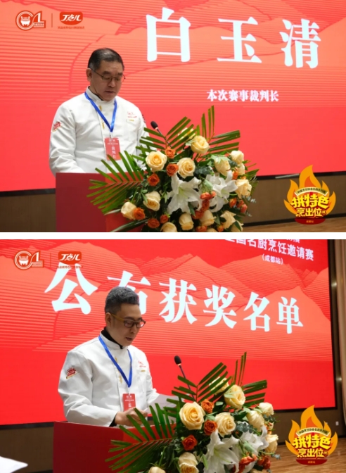 中國(guó)烹飪協(xié)會(huì)名廚專委會(huì)常務(wù)副主席、本次大賽裁判長(zhǎng)白玉清作了賽事點(diǎn)評(píng);中國(guó)烹飪協(xié)會(huì)名廚專委會(huì)常務(wù)副主席、四川旅游學(xué)院教授、本次大賽監(jiān)審長(zhǎng)蘭明路宣讀了金獎(jiǎng)前十名名單。