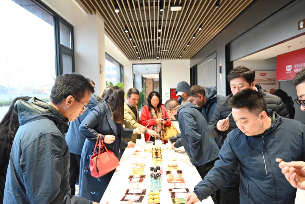 在應(yīng)用體驗(yàn)中心,丁點(diǎn)兒食品豐富的產(chǎn)品品類瞬間吸引了研修班一行的目光。大家紛紛拿起自己感興趣的產(chǎn)品進(jìn)行咨詢、品鑒,并對(duì)產(chǎn)品風(fēng)味給予了高度肯定,表達(dá)了合作發(fā)展的強(qiáng)烈意愿。