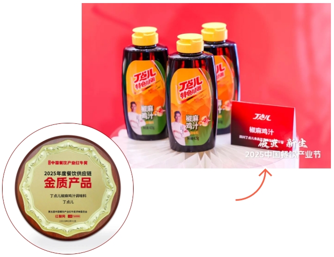 在風(fēng)向標產(chǎn)品(春季)全球發(fā)布會環(huán)節(jié),丁點兒椒麻雞汁隆重亮相,成為全場焦點,并以出色味型、獨特風(fēng)味贏得組委會和市場認可,斬獲“2025年度餐飲供應(yīng)鏈金質(zhì)產(chǎn)品”榮譽稱號。