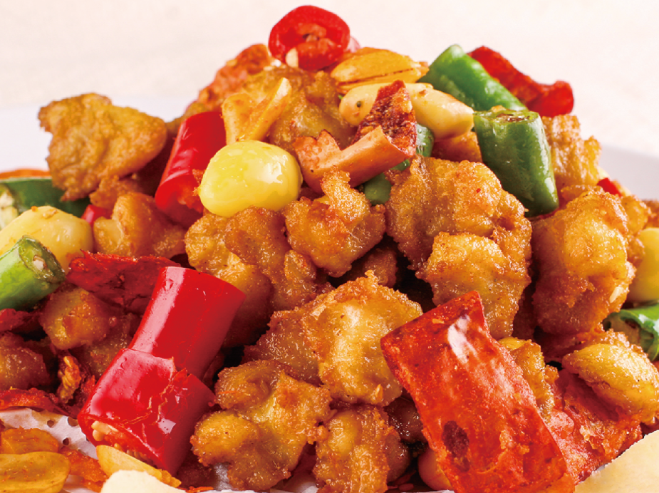 1.雞肉洗凈后控水,加入椒麻雞汁、雪花生粉腌制備用。鍋中燒油至5成熱,把雞肉、土豆炸至金黃,撈出控油備用。配菜亦拉油備用;