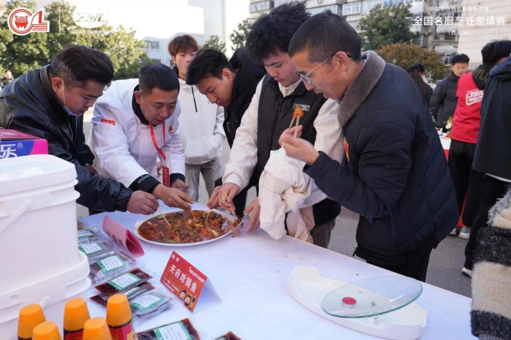 丁點兒菜品研發(fā)工程師更是現(xiàn)場操作——以干鍋醬烹制天府熗鍋魚、用泡椒醬打造泡椒鮮鍋雞……香氣四溢的菜品引得圍觀者紛紛試吃,贊不絕口!有選手邊品嘗邊豎起大拇指:“這魚外酥里嫩,醬香透骨,回家我就用丁點兒干鍋醬試試!”
